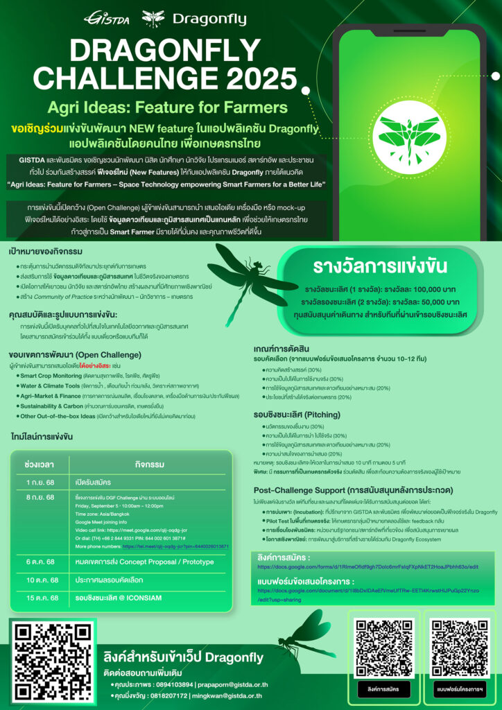 สมัคร และ ดูรายละเอียดเพิ่มเติมได้ที่ : https://dragonfly-challenge.gistda.or.th