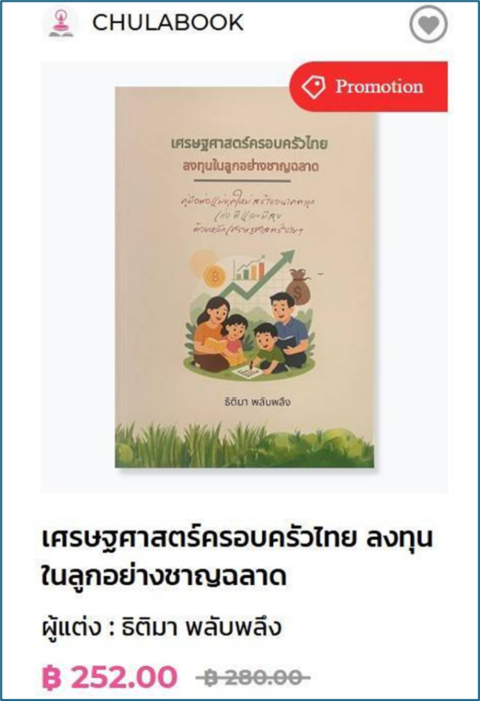 หนังสือ “เศรษฐศาสตร์ครอบครัวไทย: ลงทุนในลูกอย่างชาญฉลาด” จำหน่ายแล้วทั้งในรูปแบบหนังสือเล่ม ณ ศูนย์หนังสือจุฬาลงกรณ์มหาวิทยาลัย และรูปแบบ E-book ผ่านทางเว็บไซต์ https://www.chulabook.com/business-economics/234811